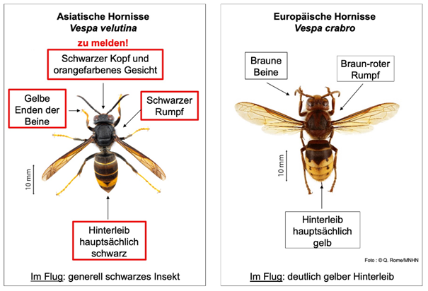 Die Asiatische Hornisse ist unter anderem an ihren auffällig gelben Beinen erkennbar. Informationen zum Aussehen der Art sowie die Meldung von Sichtungen sind auf www.asiatischehornisse.ch möglich.